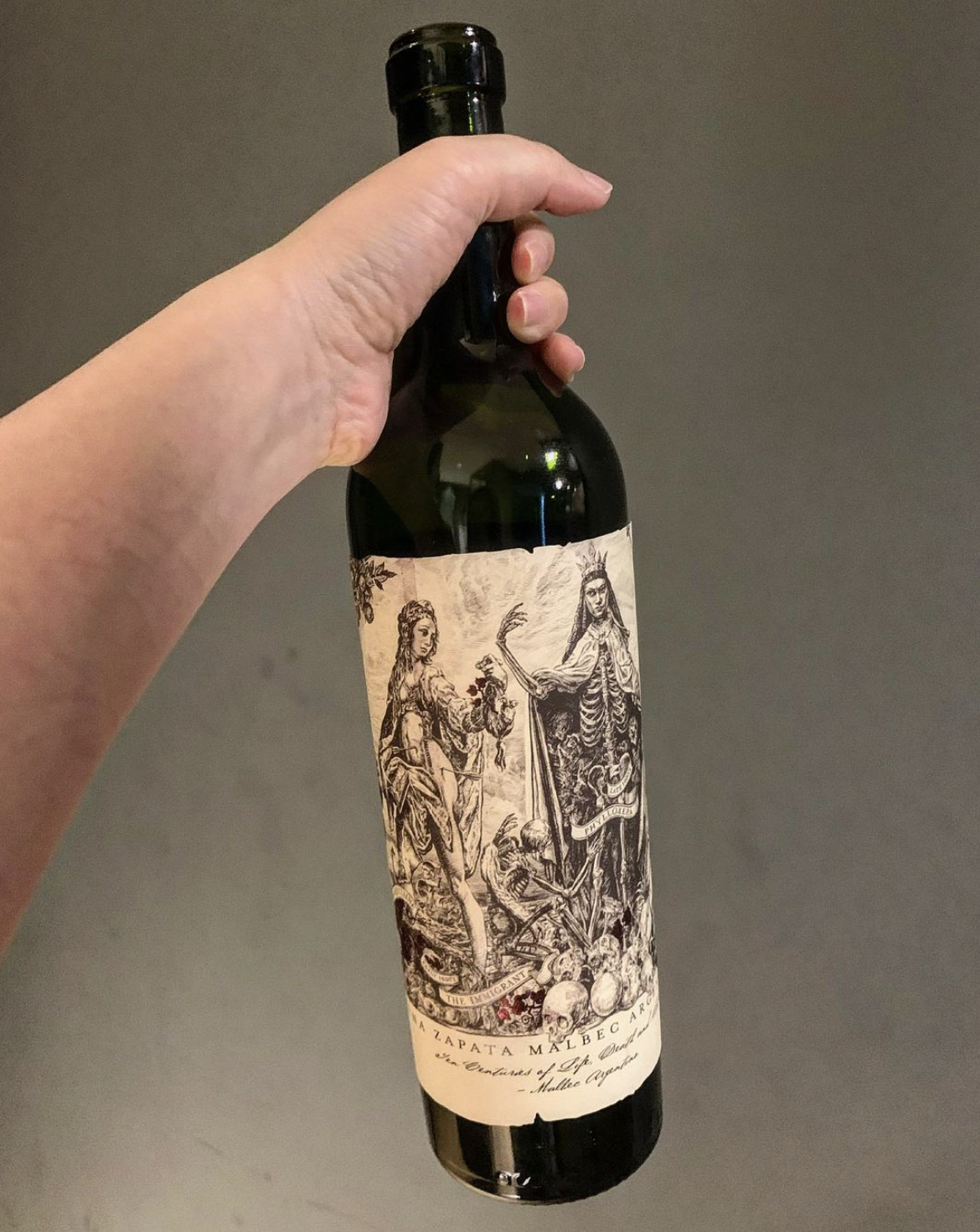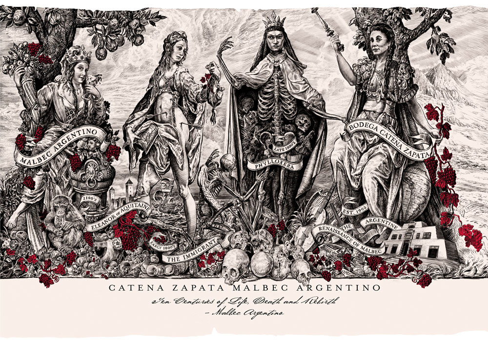 까떼나 자파타의 아이콘 와인 중 하나인 말벡 아르젠티노는 몇 해 전 새로운 레이블을 선보였다. 한눈에 보기에도 범상치 않은 이 레이블은 까떼나 자파타 가문의 4대손, 라우라 까떼나(Laura Catena)와 아드리아나 까떼나(Adrianna Catena) 자매의 작품이다. 그들은 레이블을 통해 말벡의 대서사시를 들려주고 싶었다. 특히 아메리카 대륙으로의 말벡의 여정에 초점을 맞추고, 우화적인 인물들을 통해 전지구적인 관점에서 말벡의 역사를 묘사했다. 등장 인물은 모두 여성. 보통 남성적이라 표현되는 말벡 품종에 새로운 시각을 제시하고자 했던 자매의 의도가 보인다.