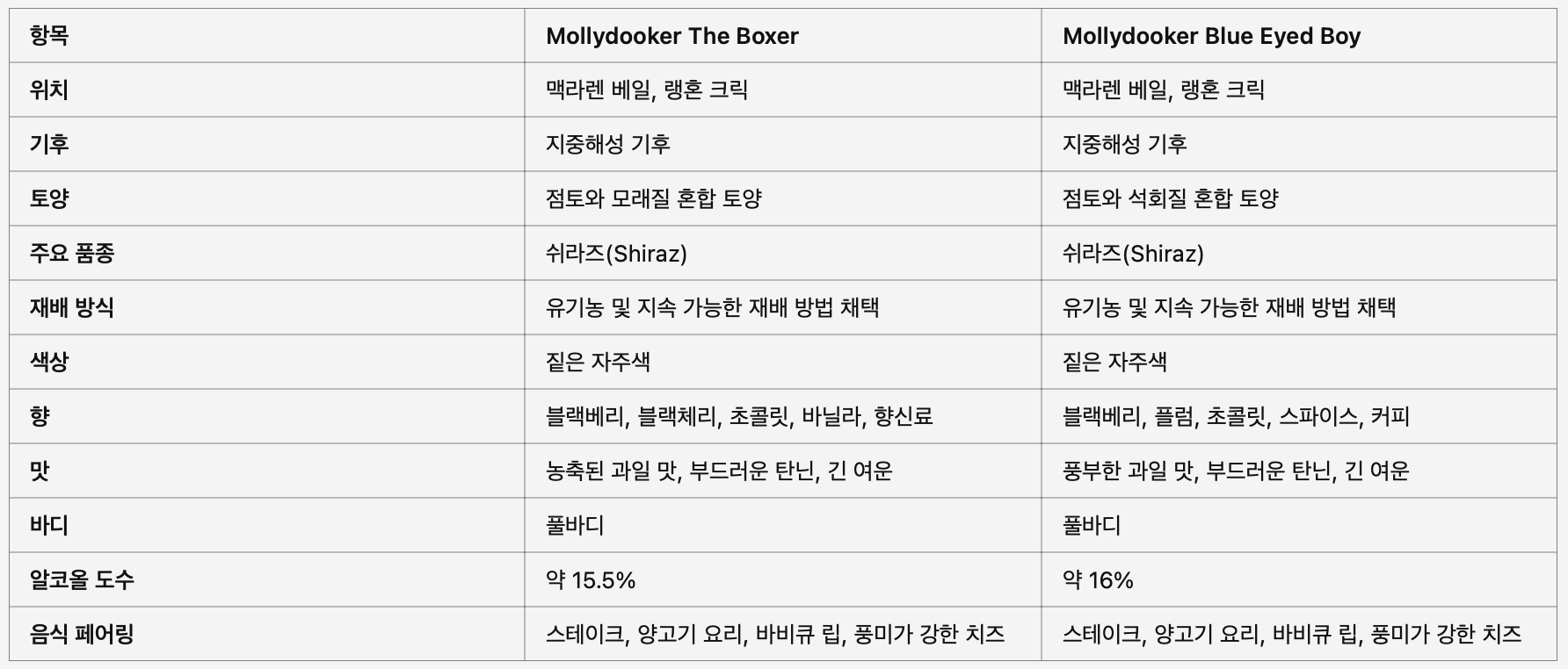 Mollydooker The Boxer와 Blue Eyed Boy는 호주의 맥라렌 베일과 랭혼 크릭 지역에서 생산되는 뛰어난 와인으로, 각기 다른 특성과 풍미로 많은 와인 애호가들에게 사랑받고 있습니다. 두 와인 모두 깊고 복합적인 풍미와 부드러운 탄닌, 그리고 긴 여운을 자랑하며, 다양한 음식과의 훌륭한 페어링을 제공합니다. 지금 한 잔의 Mollydooker The Boxer 또는 Blue Eyed Boy를 통해 호주 와인의 진수를 경험해 보세요.