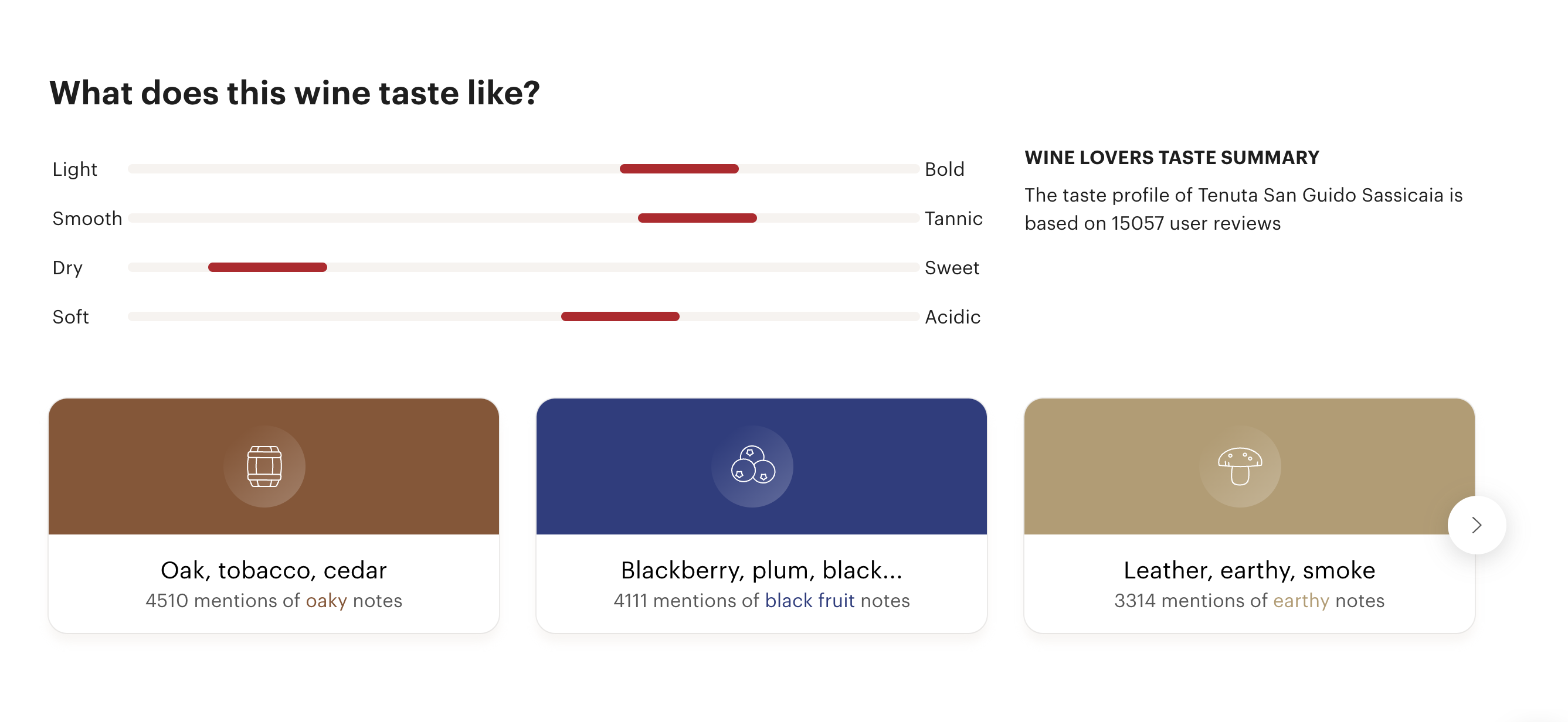 A Red wine from Bolgheri Sassicaia, Bolgheri, Central Italy, Italy. Made from Cabernet Sauvignon. This wine has 4510 mentions of oaky notes (oak, tobacco, cedar).