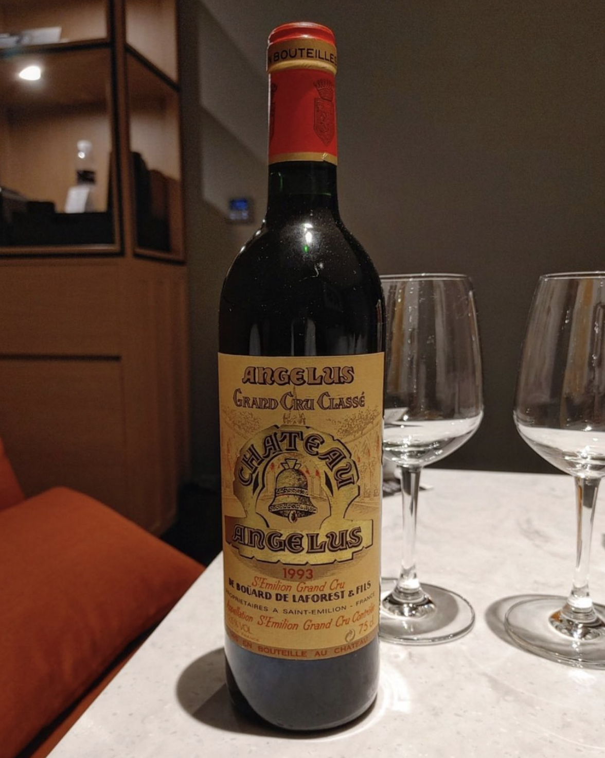 짙은 루비색을 띠며 블랙베리, 카시스, 스모크, 나무향을 느낄 수 있다. 영화 007에서 제임스본드가 즐겨마신 와인으로 쌩떼밀리옹에서 가장 유명한 와인 중 하나이다. 저명한 와인 양조학자인 미셸롤랑이 컨설팅을 하면서 높은 품질을 향상시켜 왔다. 포도를 따는 사람만큼이나 많은 수의 사람을 포도 선별 과정에 투입하여 엄선된 품질을 지향하는 안젤루스는 뛰어난 수준의 복합미와 강도를 가지고 있고 풍만하고 기름진 과일의 성향을 지니고 있다.